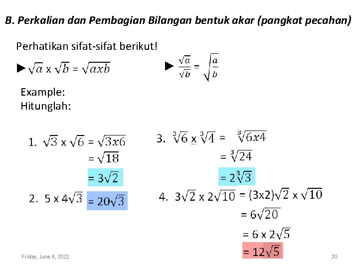 Mengubah bilangan pangkat pecahan menjadi akar. Bilangan pangkat pecahan pengertian rumus sifat operasi soal hots matematika cara menghitung pecahan materi matematika kelas v sd mi. Beberapa sifat khusus yang dimiliki oleh bilangan berpangkat pecahan sebagai berikut. Untuk menyelesaikan pecahan bentuk aljabar , prinsipnya sama dengan menyelesaikan penjumlahan pecahan biasa yaitu dengan cara menyamakan penyebutnya terlebih dahulu baru di jumlahkan atau dikurangkan. Learn new and interesting things. 5 3 4 3 5 4 3 9 3 b. pecahan campuran memiliki angka bulat dan pecahan. Menyelesaikan operasi hitung penjumlahan, pengurangan, perkalian, pembagian, pangkat dan operasi campuran pada bilangan pecahan kegiatan inti eksplorasi o konfirmasi o membantu siswa yang bermasalah o mempresentasekan jawaban soal bermasalah o memotifasi siswa yang kurang mampu agar lebih berperan aktif penutup o membuat rangkuman o mencatat. pangkat dua biasanya disimbolkan dengan angka dua kecil di ujung angka. pangkat pecahan menjadi salah satu keluarga besar dari perpangkatan, dan pangkat pecahan memiliki definisi dan rumus tersendiri dalam menyelesaikan permasalahannya, sebagai contoh: A merupakan bialangan real dan a ≠ 0 , serta m adalah bilangan bulat positif, sehingga dapat disimpulkan a 1/m = p , dimana p ini adalah bilangan real positif. Nah, pada kesempatan kali ini kita akan membahas tentang operasi hitung aljabar yang meliputi penjumlahan, pengurangan, perkalian, pembagian, dan perpangkatan lengkap dengan contoh soal dan pembahasan. Selain penjumlahan pengurangan dan perkalian variabel pada bentuk akar dapat berupa pembagian yang memenuhi sifat seperti berikut.